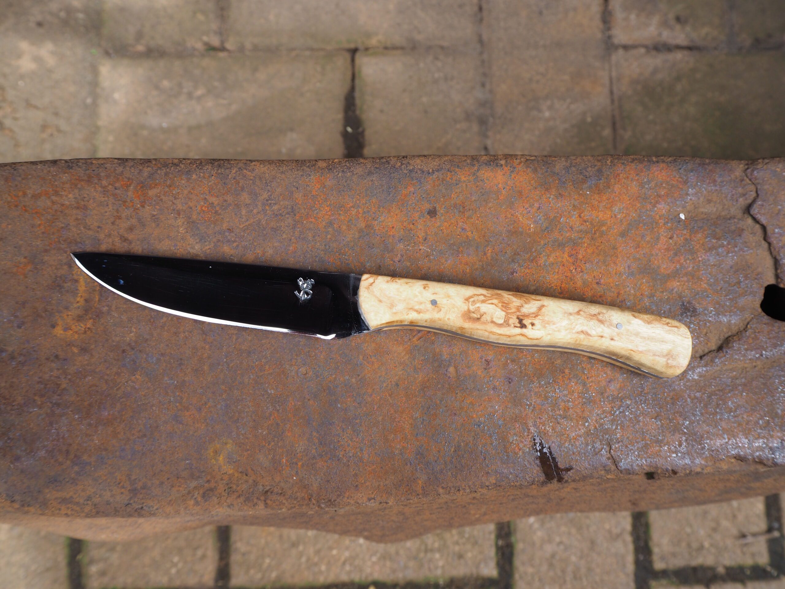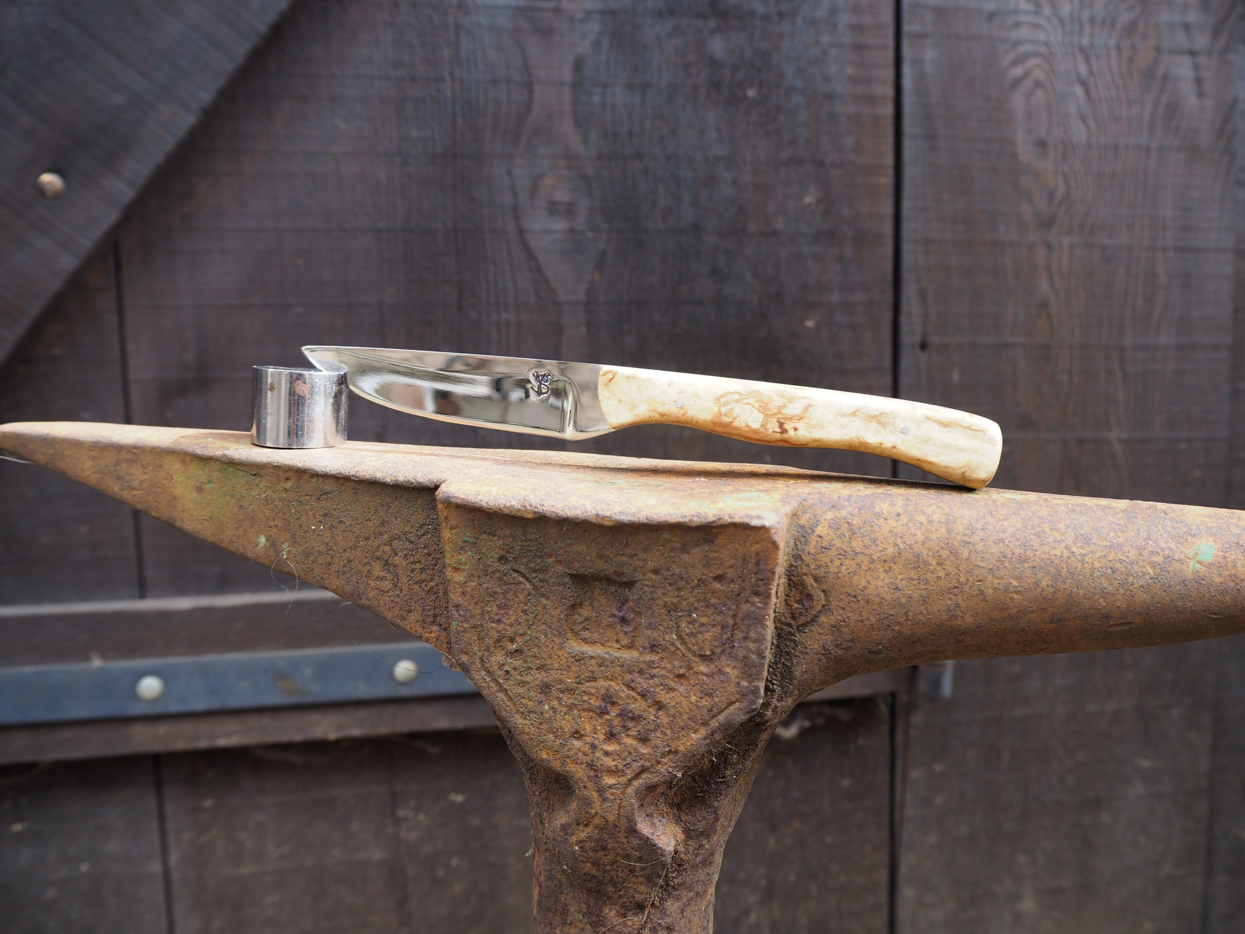 Le manche en loupe de frêne séduit par ses motifs tourbillonnants et sa chaleur naturelle. Solide et agréable en main, il garantit une prise confortable et un excellent équilibre lors de l’utilisation. Chaque couteau devient ainsi une pièce singulière, reflet du savoir-faire et des matériaux nobles employés.