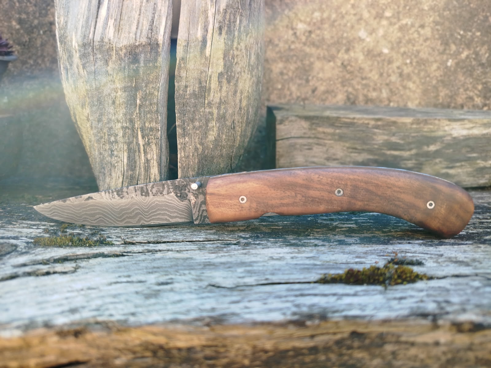 Couteau Pliant Damas Brut 72 Couches, Manche en Noyer