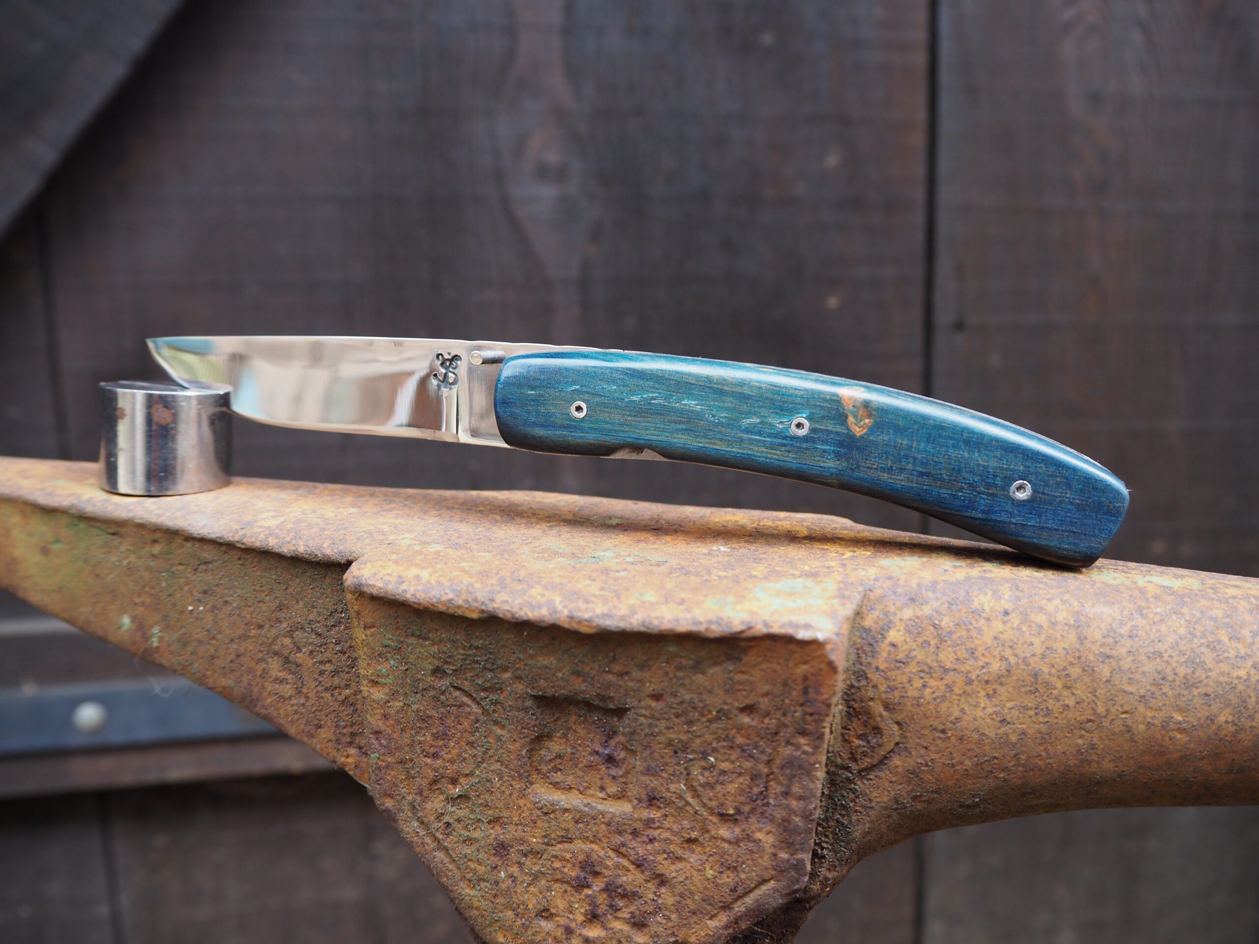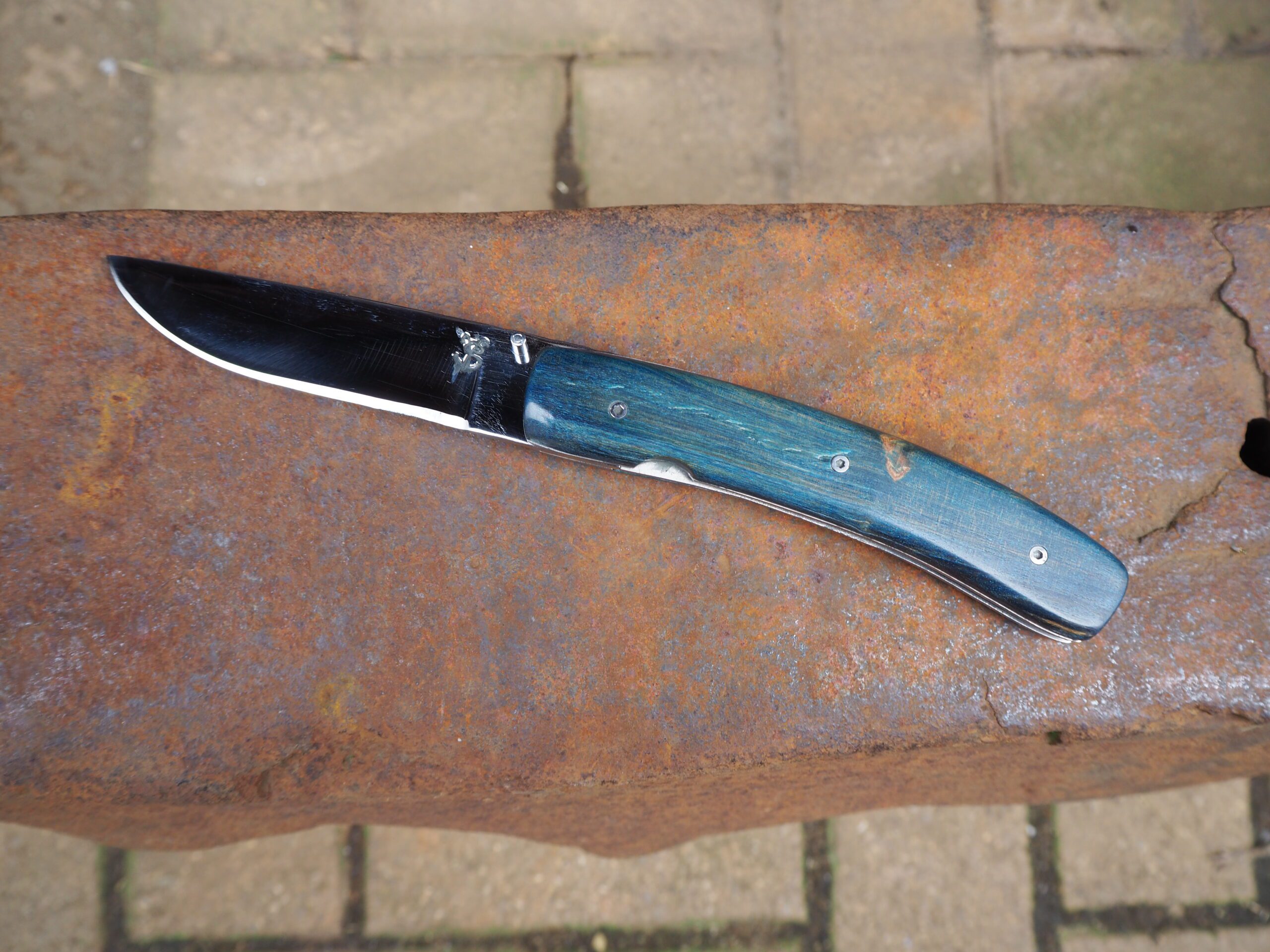 Couteau pliant en acier carbone, et manche en frene teinté et stabilisé