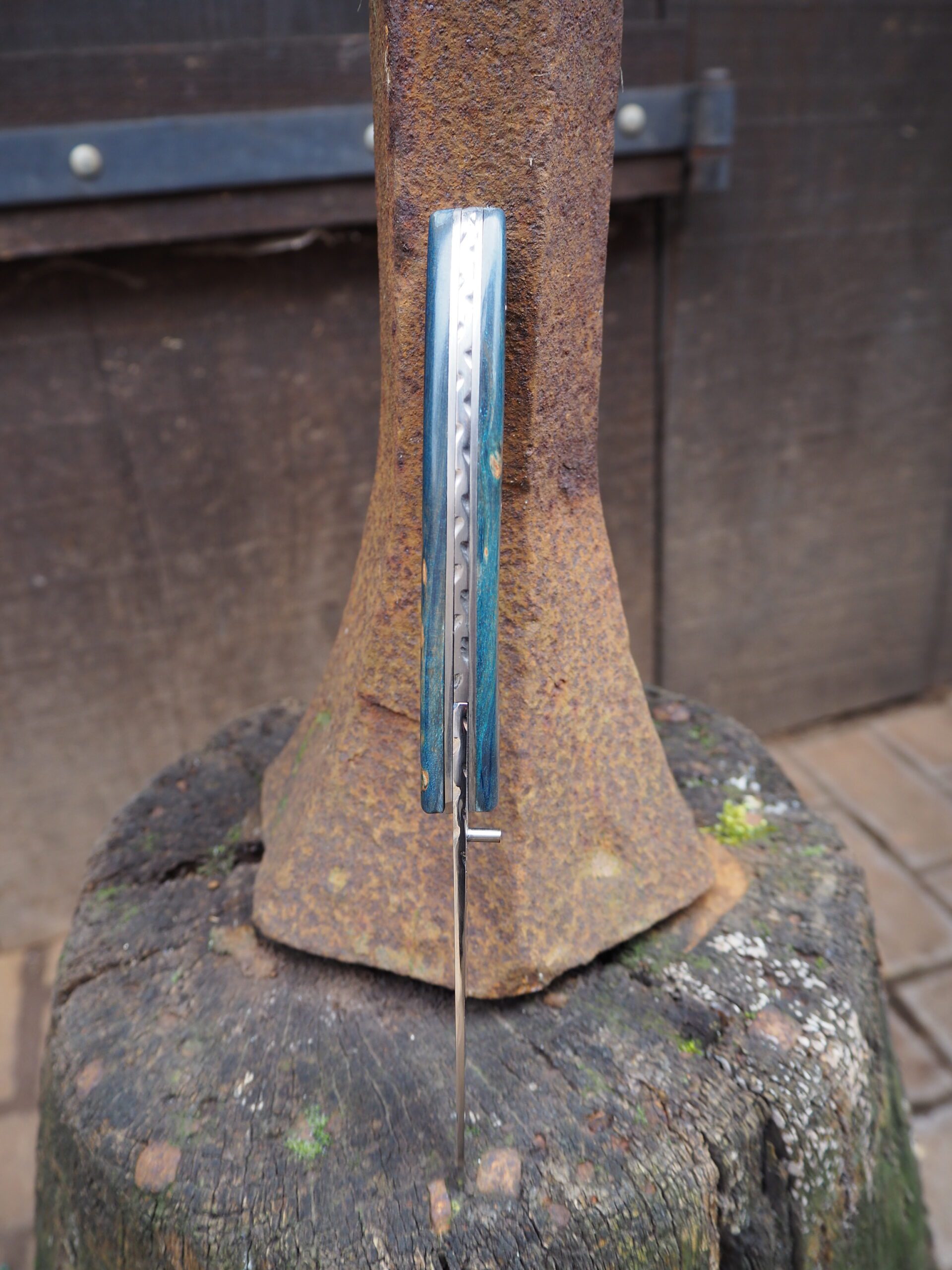 Le manche en frêne teinté et stabilisé allie esthétique et résistance. Ses nuances profondes et sa structure renforcée assurent une excellente durabilité tout en offrant une prise en main confortable et équilibrée. Chaque couteau présente ainsi une identité visuelle unique, sublimée par le travail du bois.